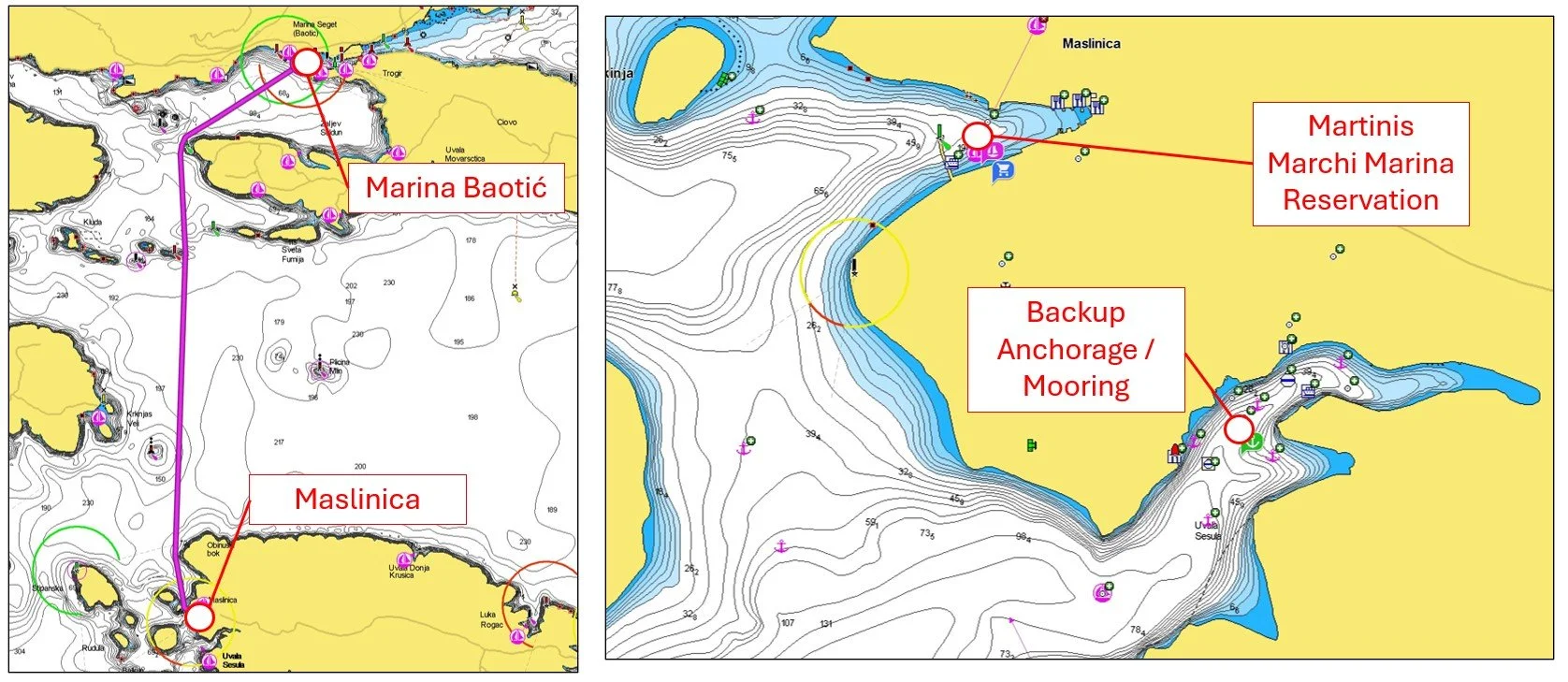 We wanted to continue our “one-step ahead” strategy by really setting some distance between us and the base marina on the first full day. At nearly 30.6nm it would take us almost the full day of sailing to get to Šćedro. We also figured that almost no other captains would attempt to go from Trogir to Šćedro on the first day as it would be about 40nm of sailing.