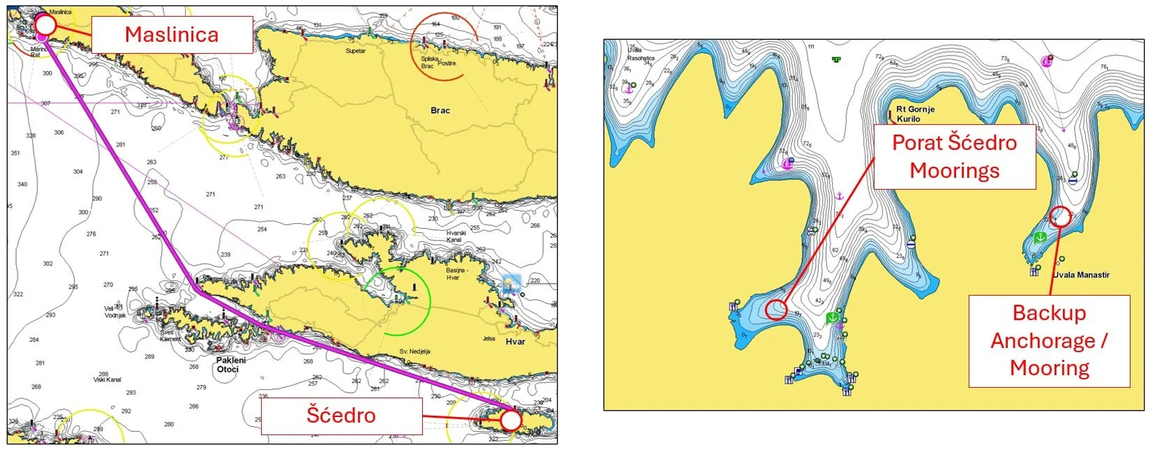 Our research indicated it gets very busy in Šćedro in summer as it’s a beautiful, quiet island. There was also some concern over backup anchorages as many areas along this part of the Dalmatian coast have steep rocky shores and are exposed. To avoid any anchor scrambling we contacted Restaurant Porat Šćedro, which offers moorings, by email and calling. We were able to get a mooring reservation while sailing there and were pleased with that as the bay would later fill up quickly after our arrival.